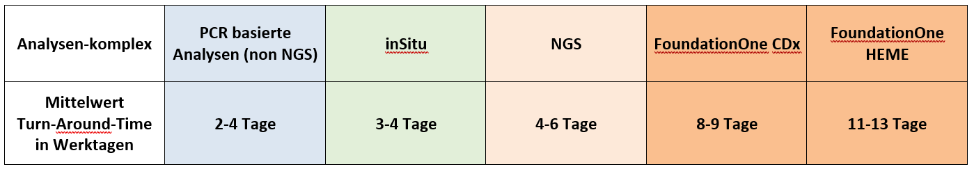 Diese Angaben stellen Mittelwerte für die jeweiligen Analysearten da und stellen ausschließlich die Bearbeitungszeit der molekularpathologischen Analyse dar. Sollten für die pathologische Diagnostik noch weitere Analysen notwendig werden, kann durch die Teilgemeinschaftspraxis Molekularpathologie Südbayern keine Aussage über die Bearbeitungszeit bis zum pathologischen Gesamtbefund getroffen werden. Zudem können Analysen durch Restrisiken (siehe Reiter Restrisiko) verzögert werden.